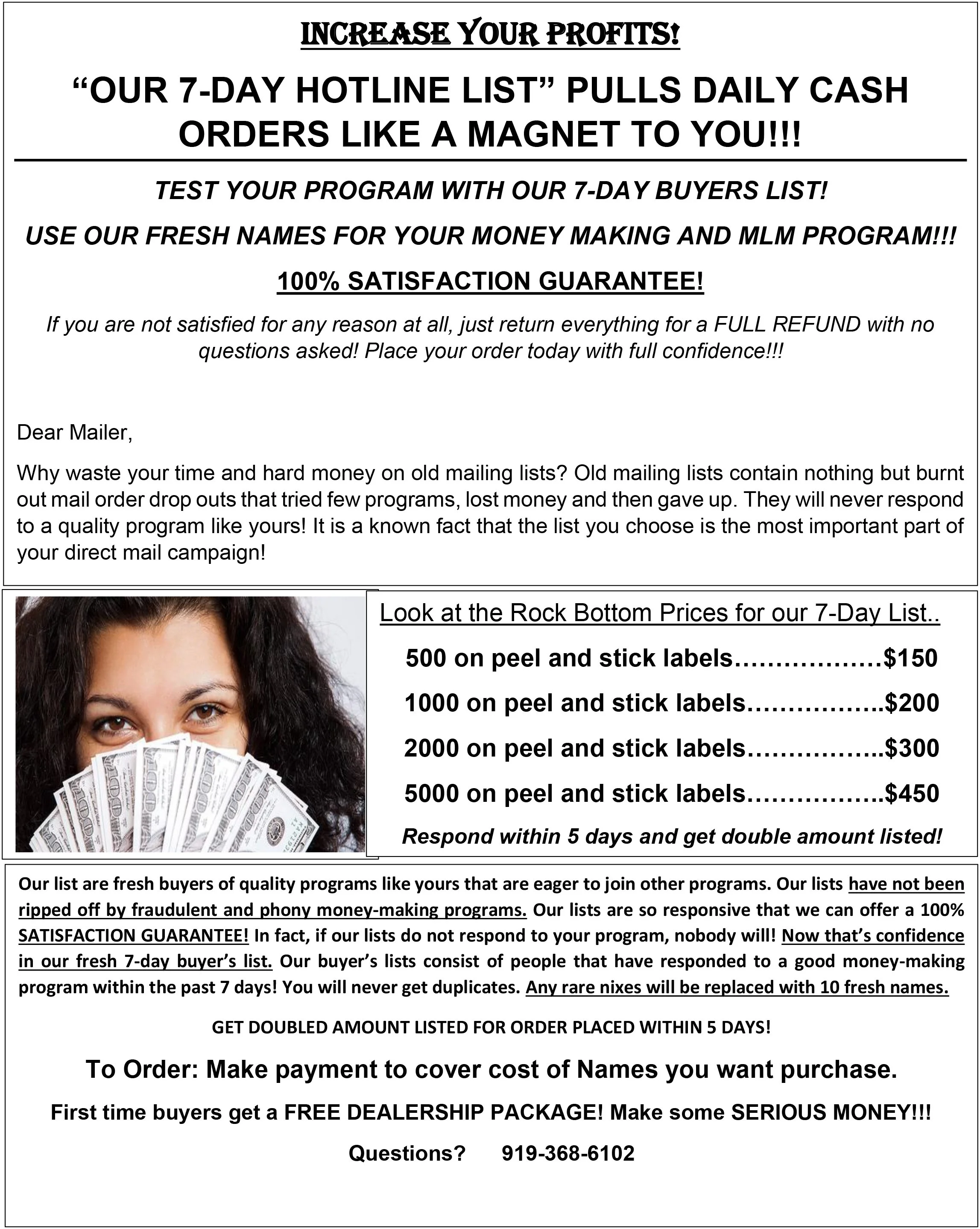 Shop Great Cash USA $199.00 Add To Cart Added! Real Millionaires $120.00 Add To Cart Added! 7-Day Hotline List from $150.00 Select Amount 500 Labels 1000 Labels 2000 Labels 5000 Labels Add To Cart Added! My Daily Bread $400.00 Add To Cart Added! MONEY BY THE MINUTE! 5.0 $300.00 Add To Cart Added!